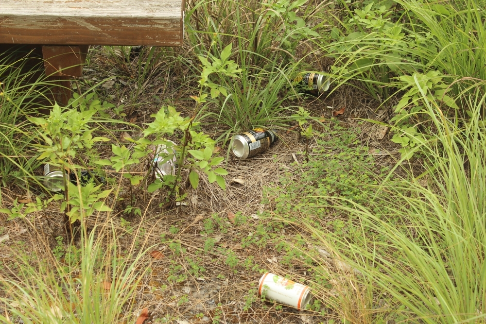 ベンチ周辺には空き缶が10本近く捨てられていました。