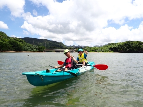 まずは、陸地でカヤックパドルの使い方のレクチャーを受けて2人1組でカヤックに乗り、吹通川の河口から上流へ進みました。