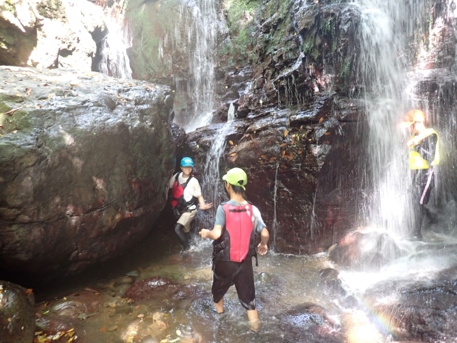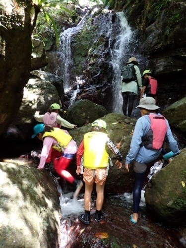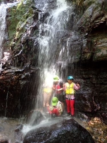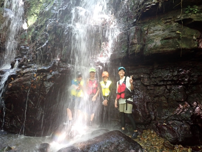 だんだんと変化する自然環境を楽しみながら、大きな岩をよじ登っていきます。ようやく滝に到着!流れ落ちる水の迫力に圧倒されながら思い思いに滝に打たれました。