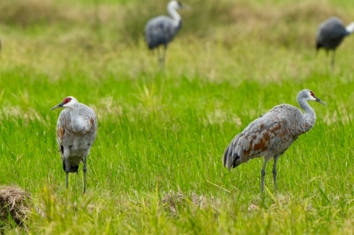 カナダヅルは全身が灰褐色で額が赤いことが特徴です。