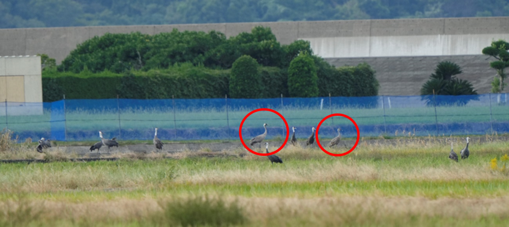 写真の中にクロヅルとカナダヅルが1羽ずつ写っています。どれかわかりますか?
