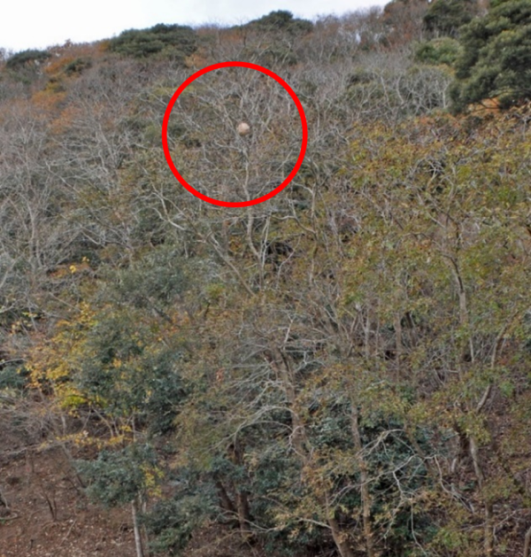 上の写真は、ツマアカスズメバチの巣を撮影したものです。一見、何の変哲も無い林を撮影しているかのように思えますが、