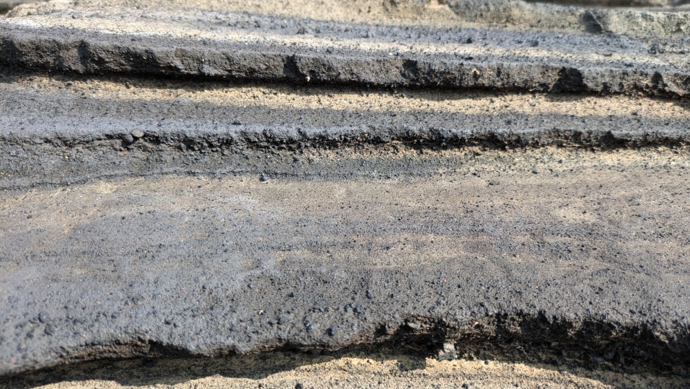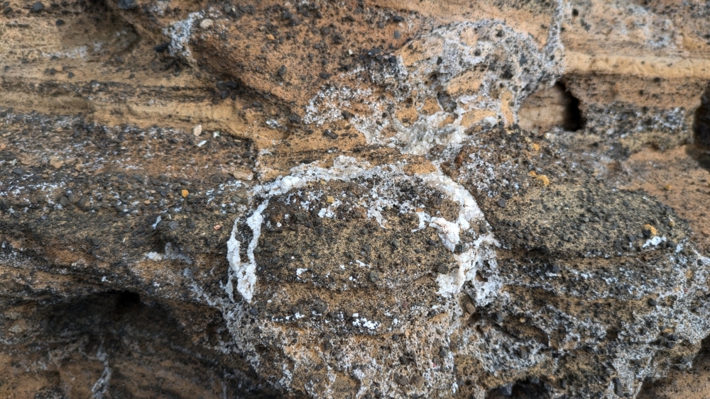 嵯峨島は初めにマグマと海水が接触して激しい爆発を起こし、マグマの破片や灰など降ったものが固まりました。そして何度も爆発を繰り返し、しましまの地層ができたそうです。