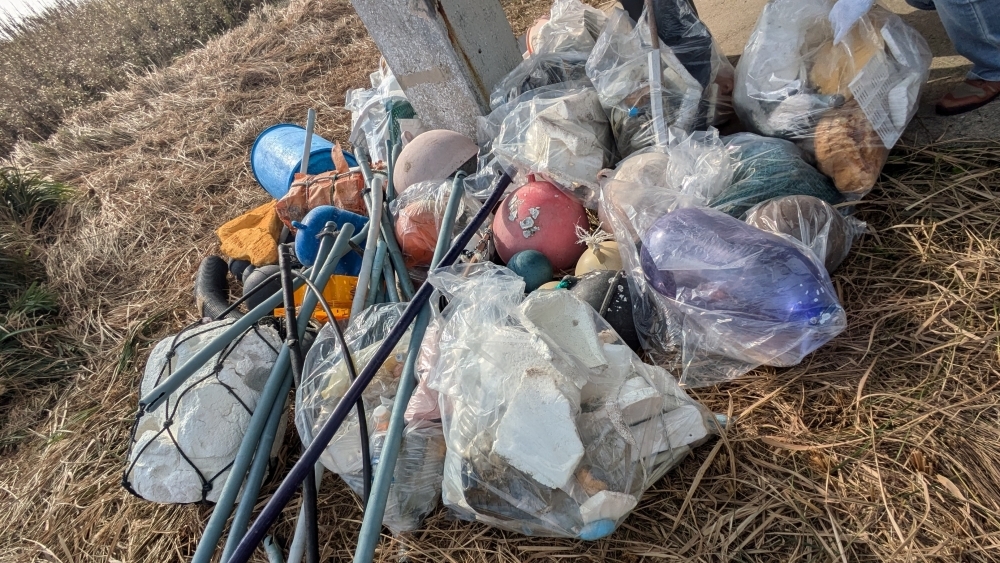 今回は玉石(荒波にもまれ石が削られ丸くなったもの)がたくさんある海岸で、波も高く上がることから発泡スチロールやウキなどの漂着物が多くあり、軽トラック4台分のごみを回収することができました。