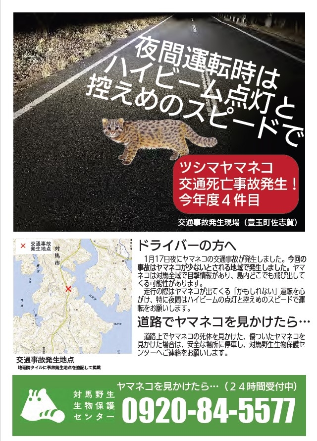 先日令和7年1月17日に、今年度4件目となるヤマネコの交通事故が発生してしまいました。