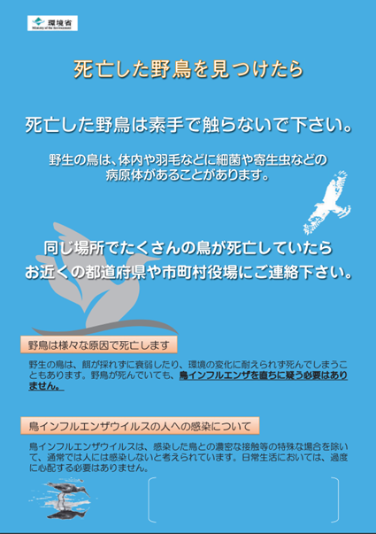 出水市内で高病原性鳥インフルエンザの陽性が確認された後、高病原性鳥インフルエンザの症状の一つである神経症状の見られる個体や死亡している野鳥を発見・回収することでその個体から別個体への感染を防止することを目的として、巡回を行っています。