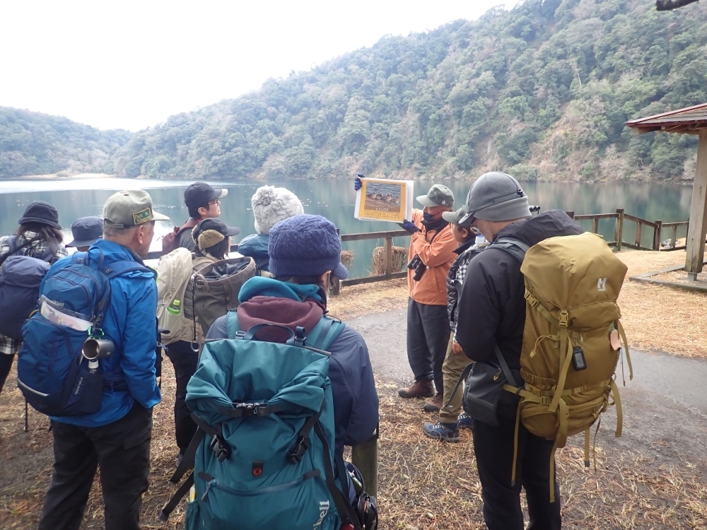 当日、6名の参加者と御池に飛来する水鳥や御池野鳥の森、または御池キャンプ場内で見られる小鳥や植物について、パークボランティアの3名の方に解説をしていただきました。