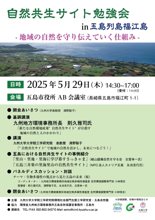この度、九州大学大学院工学研究院環境社会部門生態工学研究室と五島自然塾が主催となり、自然共生サイトに関する勉強会(講演、事例発表など)が福江島で開催されます。