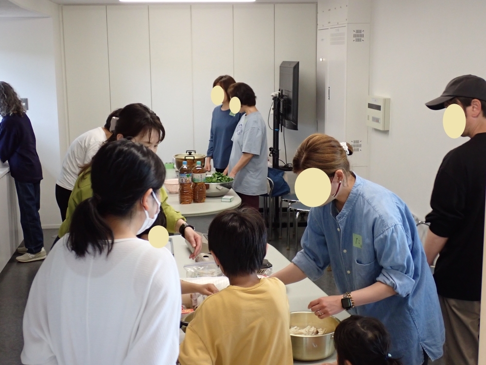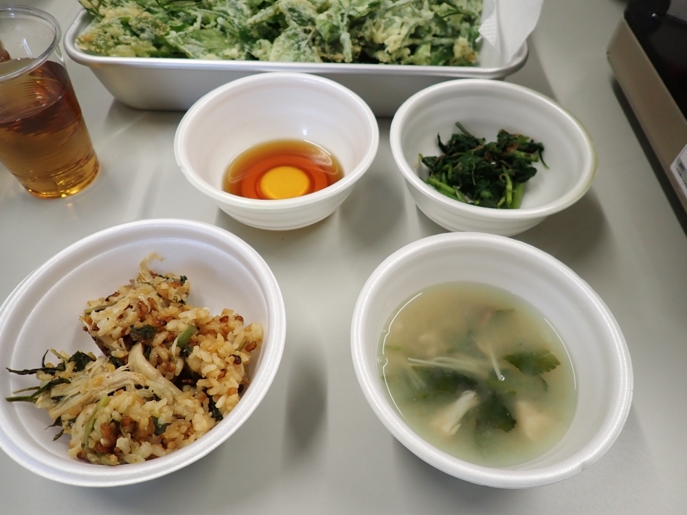 タチアワユキセンダングサを使った、炊き込みご飯・お味噌汁・お浸し・天ぷらの4品をみんなで作り、最年少の参加者に「いただきます!」の声かけをお願いしました。