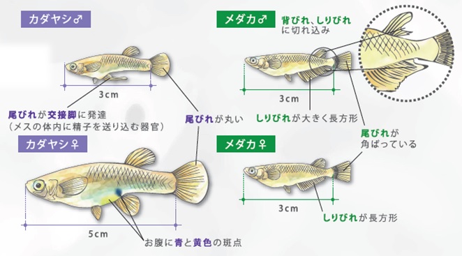 カダヤシ(Gambusia affinis) 北アメリカ原産。和名は「蚊絶やし」の意味で、蚊の幼虫ボウフラを捕食することから蚊の発生を抑えるために世界各地に導入された。在来種メダカと競合するため、気づかぬうちにメダカが本種に置き換わっていたということがある。メダカやグッピーに似るが、ひれの形や位置などで区別することができる(・メダカとの識別方法)。 ![]() |