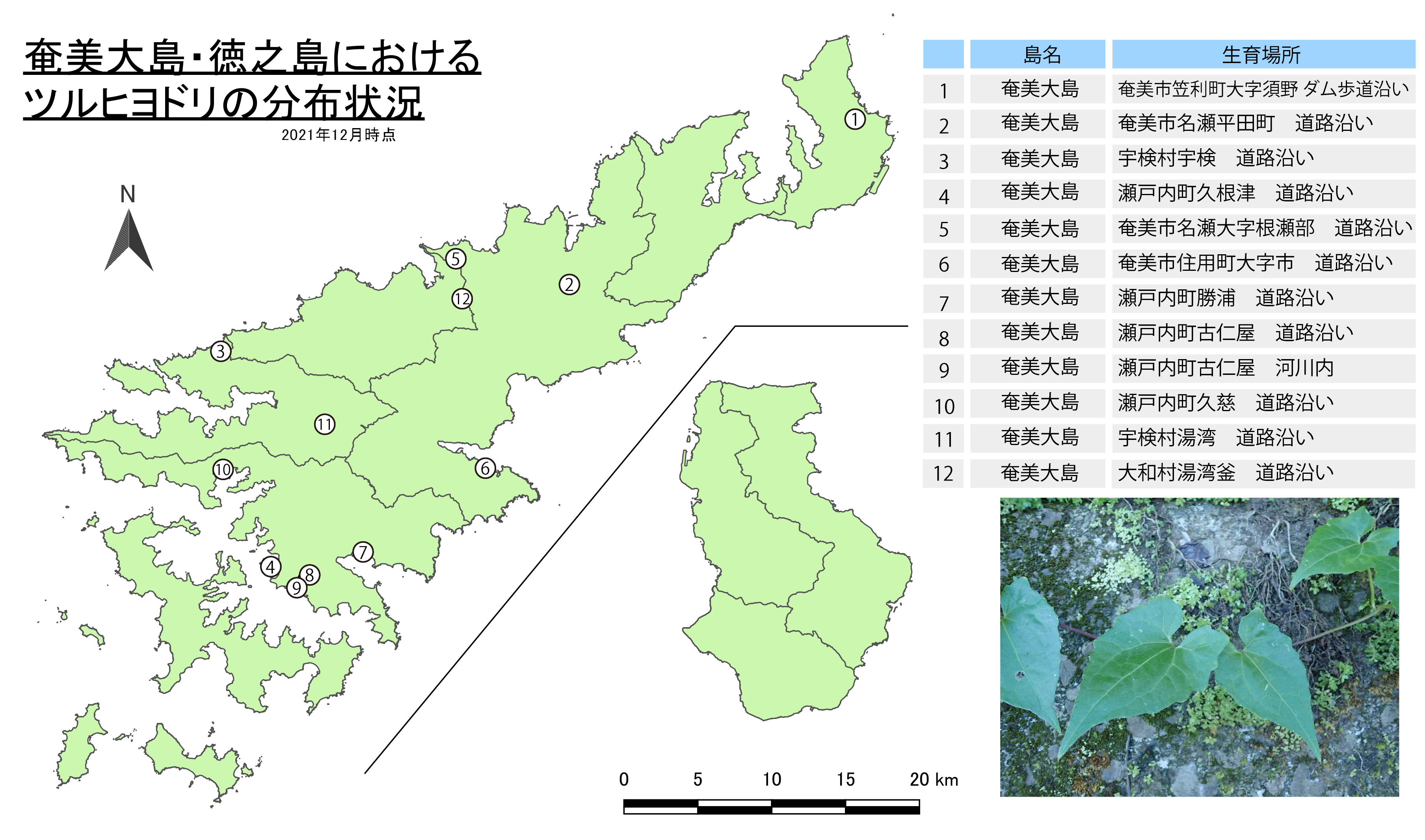 ツルヒヨドリ(Mikania micrantha) ![]() 中南米原産のキク科の多年生ツル植物。葉の縁はギザギザで、同じ場所から二枚の葉が出る(対生)。著しい速さで他の植物に覆い被さるように成長し、光を遮り枯死させる。国内では1984年に沖縄県うるま市で初めて見つかり、近年奄美大島でも生育が確認された。侵入は比較的初期段階であると考えられ、島内からの完全排除を目指している。R3.12月現在、奄美大島では12カ所で生育が確認されている。 |