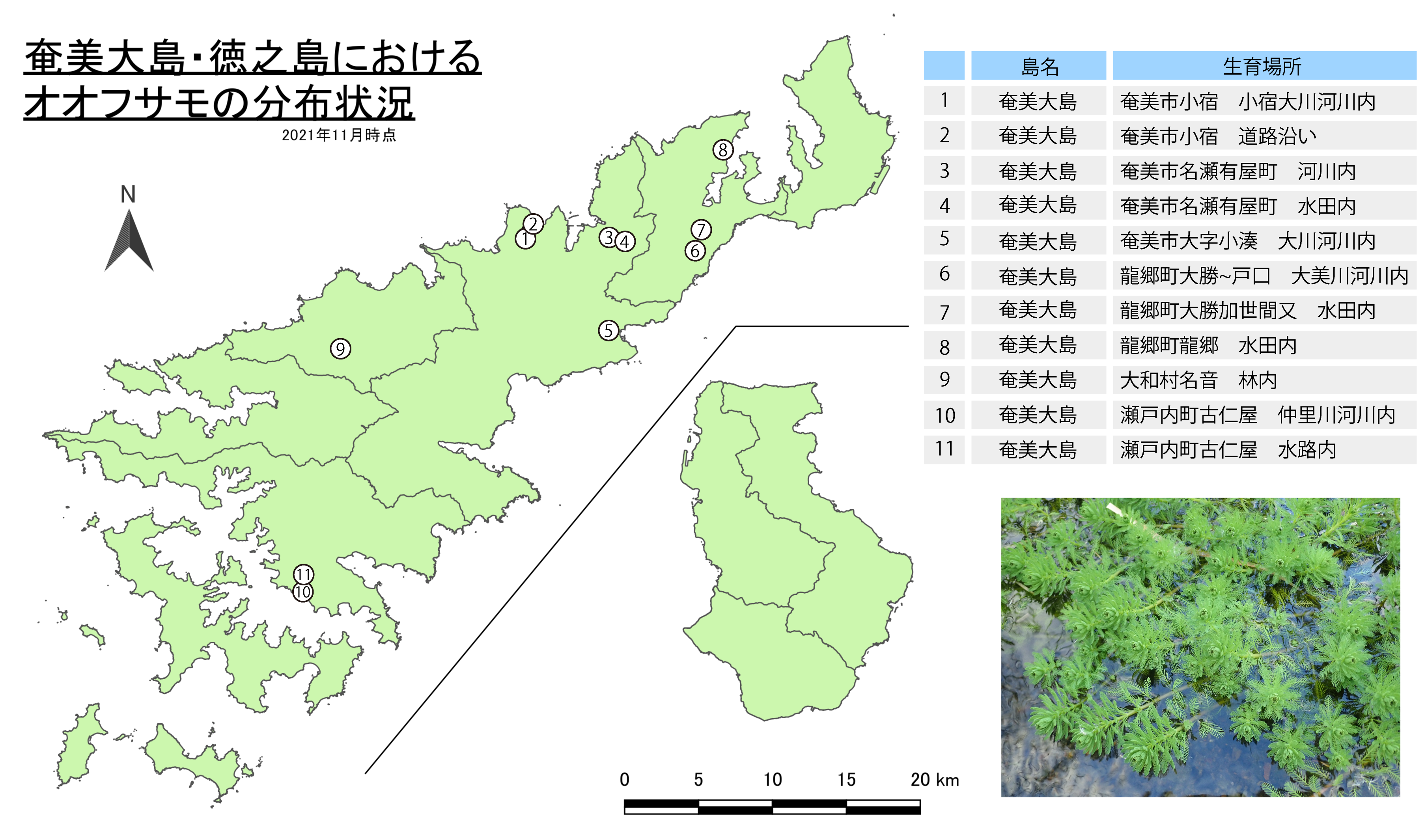 オオフサモ(Myriophyllum aquaticum) ![]() 南米原産の水草。その可愛らしい見た目から、かつては水槽用の水草として流通。日本にあるのは全て雌株で、すべて栄養繁殖をしていると考えられている。河川湖沼、水田、水路で繁茂し、在来種との競合、流水・通行阻害などが生じる。R3.12月時点では、奄美大島では11カ所で生育が確認されている。 |