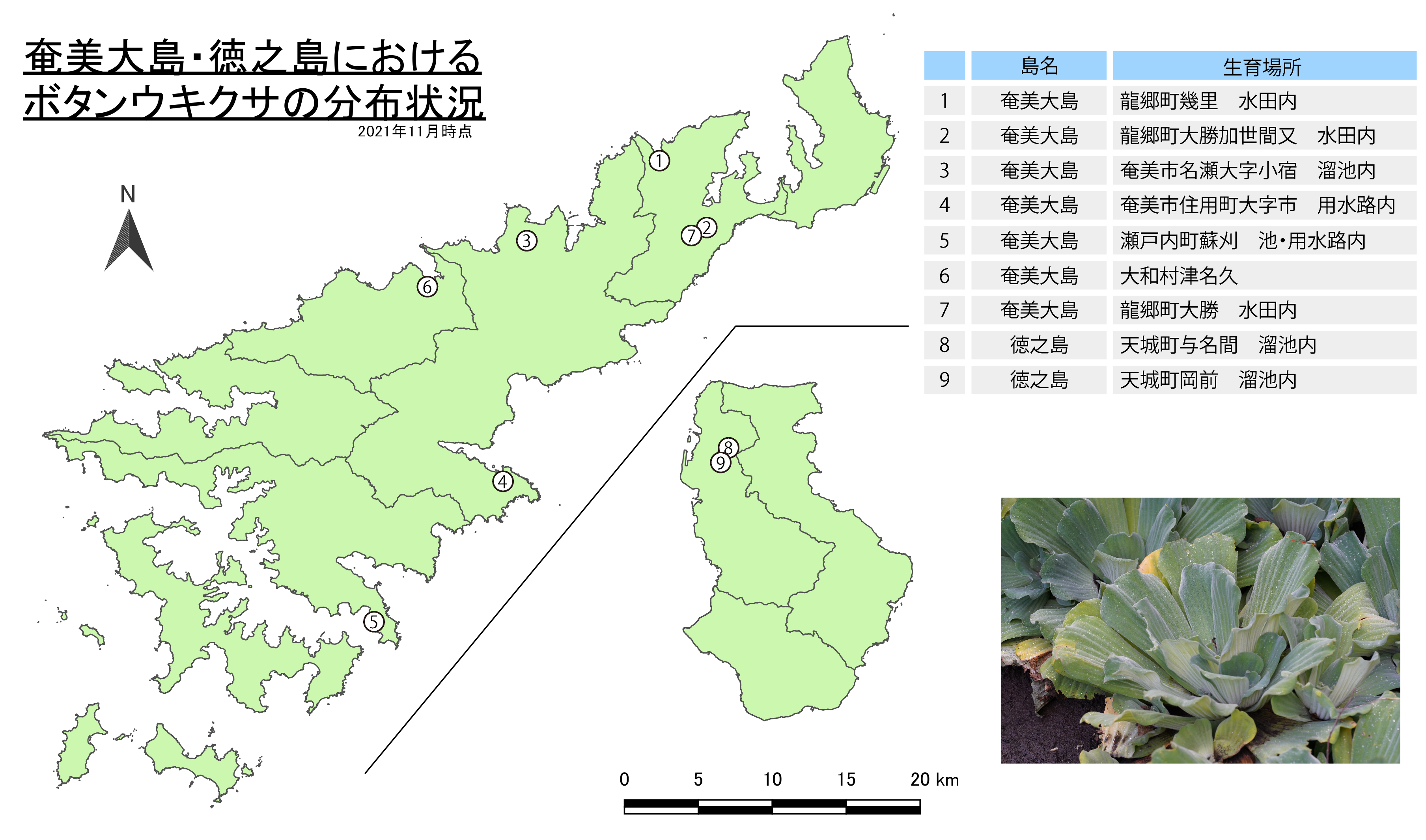 ボタンウキクサ(Pistia stratiotes) ![]() アフリカ原産の水草。別名ウォーターレタス。繁殖力が強く、水面を覆い尽くすように成長する。種子繁殖をする他、走出枝を伸ばして子株を多数つける栄養繁殖も行う。水路の通水障害や水中の酸素、日光不足を引き起こす。R3.12月時点では、奄美大島では7カ所で生育が確認されている。 |
