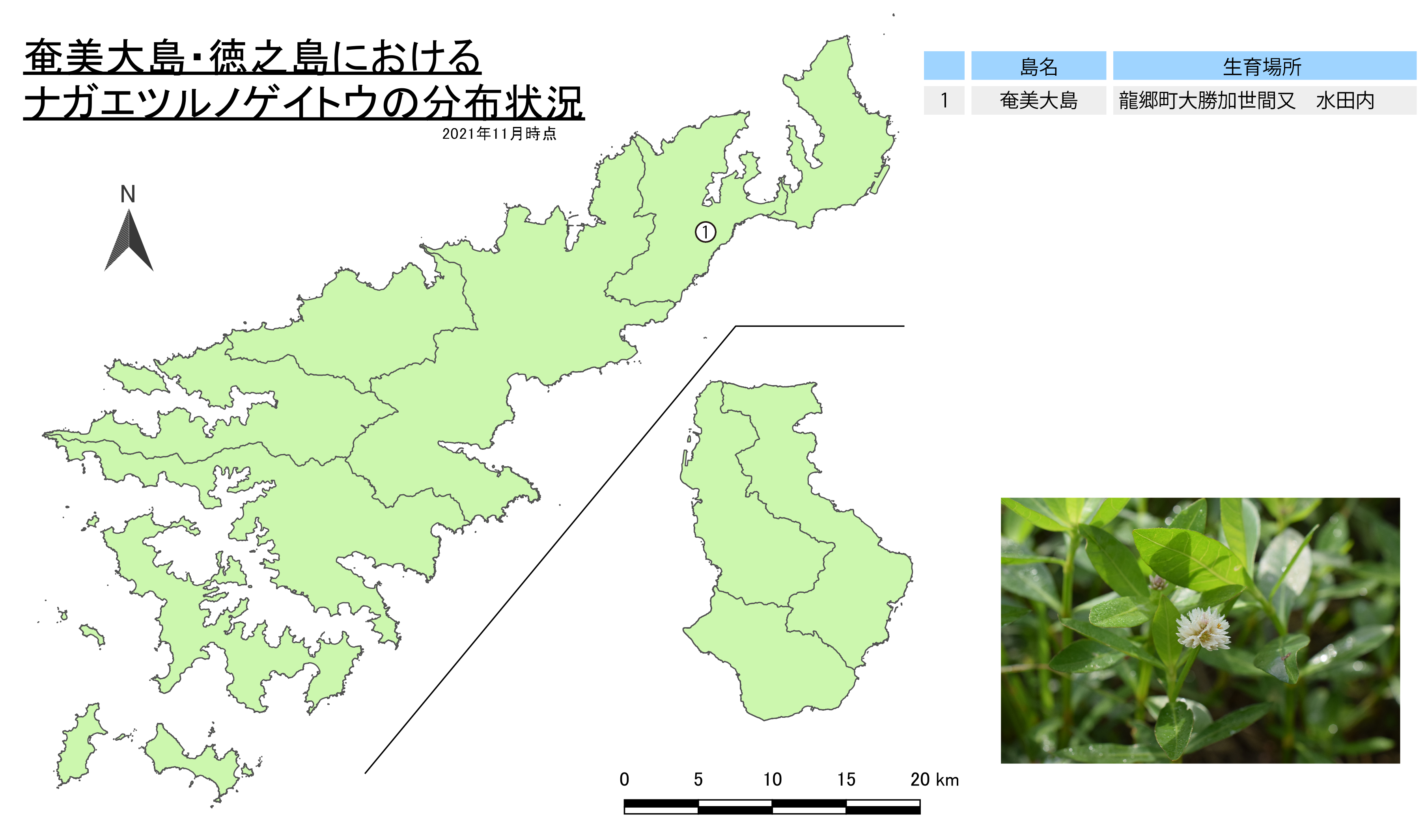 ナガエツルノゲイトウ(Alternanthera philoxeroides) ![]() 南米原産のヒユ科の多年草。観賞用の水草として持ち込まれたと考えられている。茎は中空で絡まり合いながらマット状に広がる。また茎は折れやすく、折れた断片から発根して増えるため注意が必要。水草だが乾燥にも強く、水田の畦道など陸上でも生育する。4月頃から白い花を咲かせる。和名は花序の長い柄に由来し、近縁種との分類もこの点が最もわかりやすい。 R7.3月現在、奄美大島では1カ所で生育が確認されている。 |