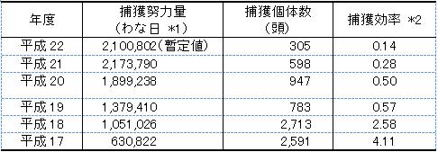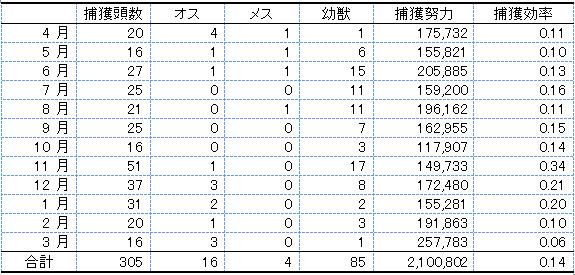 表1.捕獲努力量・捕獲個体数・捕獲効率