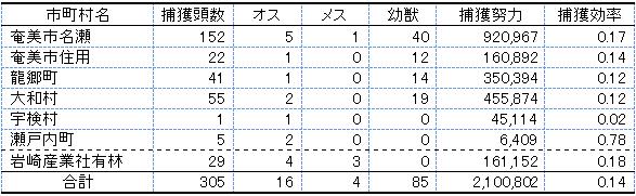 - 地域別にみると、最も捕獲数の多かったのは奄美市名瀬地区(152頭)で、大和村(55頭)や龍郷町(44頭)を大きく上回りっています(表3)。奄美市住用地区では22頭、宇検村では1頭が捕獲されましたが、宇検村の捕獲効率は地域別で最も低い0.02となっており、捕獲される個体がわずかに残存している状態と考えられます。また、岩崎産業(株)の社有林内では、昨年度(30頭)と同程度の29頭が捕獲されました。