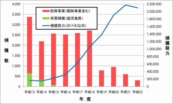 - 平成22年度防除事業において投入された捕獲努力量は、平成21年度よりも3%程度少ない約210万わな日となりました(表1)。この結果は、昨年秋の豪雨災害によって捕獲作業が滞った期間が生じたことなどが影響しています。