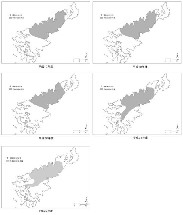 図3.防除事業開始以降のマングース分布域の経年変化