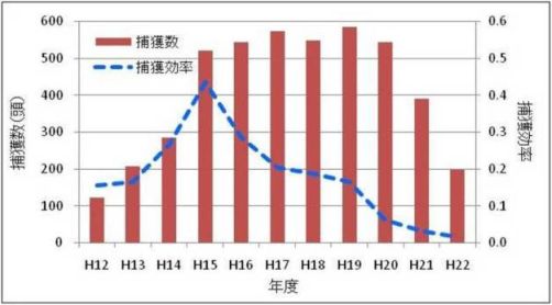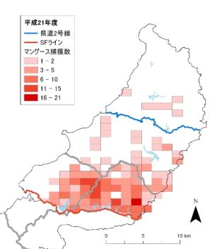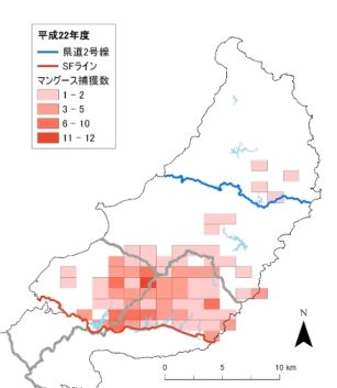 SFライン以北でのマングース捕獲数は、平成15年度から平成20年度までは毎年500~600頭で横ばいの状態でしたが、平成21年度は390頭に減少し、平成22年度は過去最高の捕獲努力量を投入したにもかかわらず、199頭とさらに減少しました(図2)。それに伴い、マングースの捕獲効率(100わな日あたりの捕獲数)も年々減少しています。これらのことから、沖縄島北部地域におけるマングースの個体数は減少傾向にあると考えられます。さらに、平成22年度は国頭村の西側でほとんどマングースが捕獲されなかったことから、マングースの分布域が縮減している可能性があります(図3)。今後は探索犬等のモニタリングで得られたマングースの分布情報と比較を行い、マングース個体数の減少及びマングース分布域の縮減をより明確にしていきたいと考えています。