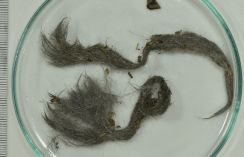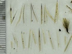 また、探索犬がマングースの分布域の北端周辺で発見したマングースの糞(21個)を調べたところ、オキナワトゲネズミの被毛(1件、図5)、ケナガネズミの被毛(3件、図6)、ヤンバルクイナの羽毛(1件)が確認されました。沖縄島においてマングースによるオキナワトゲネズミ、ケナガネズミの捕食が確認されたのは初めてのことです。マングースの分布域の北端周辺では、希少な在来生物の捕食が高頻度で起こっていると考えられます。
