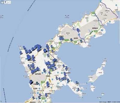 - 沖縄島におけるタイワンスジオの分布域.このほかにも本部半島の一部地域にも定着しているとの情報があります. Google mapにより作成
