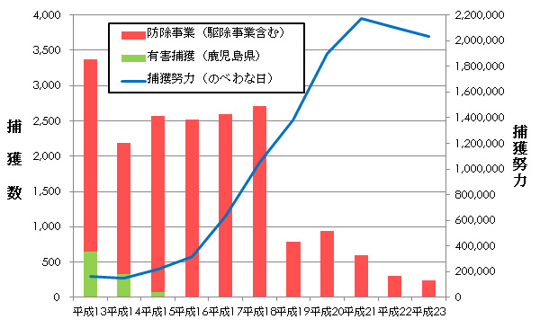 図2.奄美大島におけるマングースの捕獲頭数及び捕獲努力の経年変化