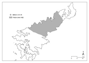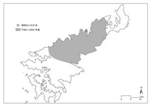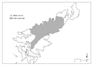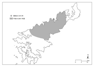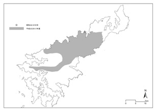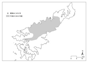 • 生息密度を考慮しない見かけ上の分布域は、南西部での生息確認により平成21年度以降拡大したままの状態です。平成23年度は宇検半島の西部で捕獲があったため、その分拡大しました。また分布域北東部の龍郷半島北部で探索犬及びハンドラーによる捕獲があったため、局所的な分布域として反映しました。なお、全域の生息密度については、前述のとおり低密度化が一層進行したと考えられます。