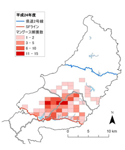 SFライン以北でのマングース捕獲数、CPUE(100わな日あたりの捕獲数)は前年度に比べ、若干の減少にとどまりましたが、最も捕獲数の多かった平成19年度と比べると、3分の1程度の捕獲数であるため、沖縄島北部地域におけるマングースの個体数は依然少ない状態と考えられます(表1、図2)。また、これまで国頭村安田周辺で少数ながらマングースが捕獲されていましたが、平成24年度は捕獲がありませんでした。さらに大宜味村、東村においても海岸側では捕獲が少なくなっていることから、マングース分布域が縮小している可能性があります(図3)。