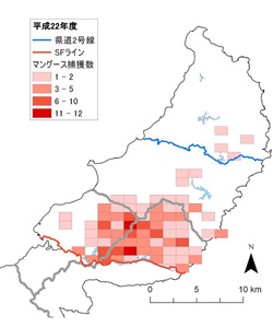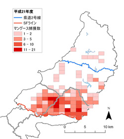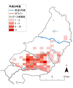 沖縄県はSFラインから国頭村伊地と安波を結ぶラインまで、環境省はこの伊地と安波を結ぶライン以北の地域でそれぞれ捕獲を実施し、合計203頭のマングースを捕獲しました。平成23年度に比べて、マングースの捕獲数、CPUE(100わな日あたりの捕獲数)ともに減少しました。また、平成24年度は、これまで少数ながら捕獲があった国頭村安田周辺でも捕獲がありませんでした。これらのことから、沖縄島北部地域に残存するマングースの個体数は少ない状態が継続しており、分布域も縮小してきていると考えられます。 - ②