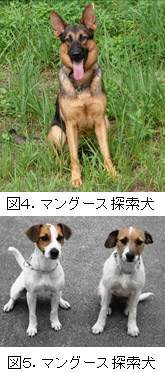環境省は平成21年度より、沖縄県は平成23年度よりマングースやその痕跡を探索することができるマングース探索犬(シェパード、図4)を導入し、マングースの分布状況の把握を開始しています。平成24年度は合計で710.4kmの探索を行い、386件のマングースの痕跡(糞386件)を発見しました。マングースがしばらく捕獲されていない地域で痕跡が確認されたり、痕跡の確認地域の周囲でマングースが捕獲される事例もあるなど、探索犬ならではの成果が得られました。