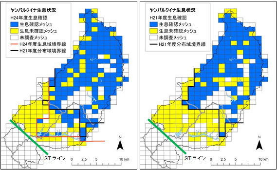ヤンバルクイナは、発見当初の1980年代には大宜味村塩屋湾と東村平良湾を結ぶライン(STライン)以南でも生息が確認されていましたが、マングースの北上に伴い、分布域が縮小しました。環境省のプレイバック調査※では、平成21年度には国頭村と東村の一部でしか生息が確認できませんでした(図6右,合計128メッシュで確認)。しかし、マングースの防除が進み、マングースの個体数及び分布域が縮減したことで、ヤンバルクイナの分布域、生息数が回復する傾向が見られはじめました。平成24年度は、特に東村側で連続して確認されるメッシュが増加しました(図6左,合計152メッシュで確認)。また、北からの連続した分布とはなっていませんが、大宜味村の大保ダム周辺、東村の福地ダム周辺でも生息が確認されました。