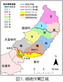 平成25年度から新たに第2期計画に基づいて作業を開始しています。SFライン以北を「完全排除地域」として、これを8つの根絶作業区域に分割し、順次地域根絶を確認しながら南下させていく計画です。平成25年度はこれまで捕獲がほとんどされていない地域(図7、根絶作業区域Ⅰ)において地域的な根絶を達成すること、完全排除地域の中でも比較的マングースの生息密度の高い地域(根絶作業区域ⅤからⅧ)でより効果的にマングースの低密度化を達成することを目標として、以下の作業を行っています。