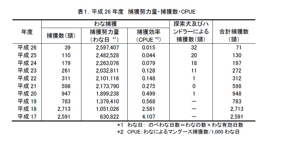 - ○ わなによるマングースの捕獲数は39頭で、平成25年度(捕獲数:110頭)よりも約65%減少し、過去最低値を記録した(表1、図2)。マングースの生息密度を相対的に反映すると考えられるCPUE(1,000わな日あたりのマングース捕獲数)は0.015で、平成25年度(CPUE:0.044)よりも66%程度減少し、防除事業開始以降減少を続け、防除事業を開始した平成17年度(CPUE:4.107)の0.36%程度になるまでに至った(表1)。