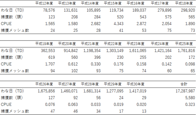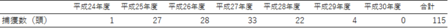 表1.平成30年度までのわなによるマングース捕獲結果
