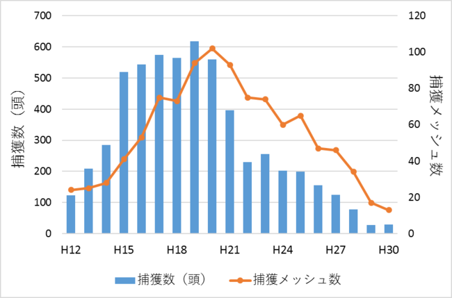※メッシュ: 基準地域メッシュ(三次メッシュ)と呼ばれるもので、おおよそ1km四方。捕獲結果の集計に用いている。