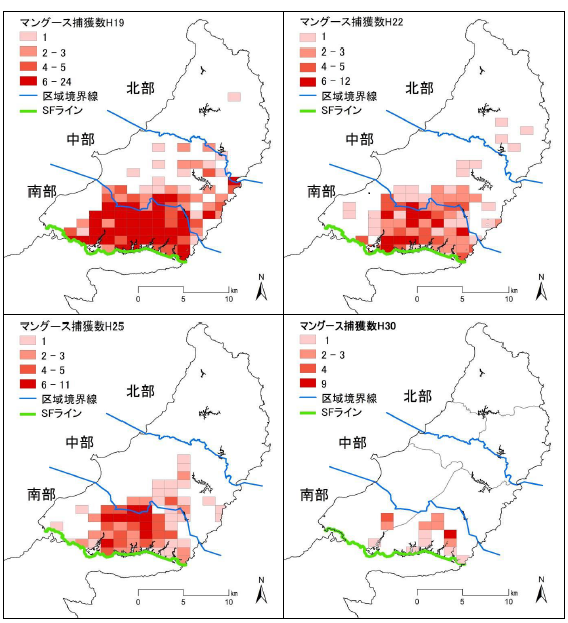 図3.年度ごとのマングース捕獲メッシュ