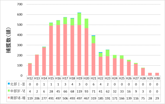 第3期計画では、沖縄島北部地域を河川やダム湖などを境に8つの作業区域にわけ、マングースの生息密度の低い北側からマングースを地域的に排除していくこととしています。マングース防除の進捗を詳細に評価するために、沖縄島北部地域を北部(作業区域Ⅰ、Ⅱ、Ⅲ)、中部(作業区域Ⅳ、Ⅴ、Ⅵ)、南部(作業区域Ⅶ、Ⅷ)の3つの地域に分けて捕獲結果を集計しました(図4、図5)。