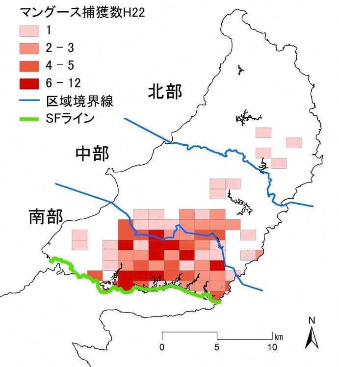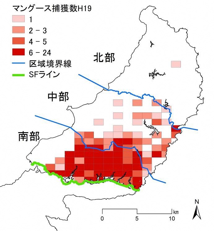 フイリマングースは明治43(1910)年に沖縄島の那覇市郊外に持ち込まれた外来種です。沖縄島南部に定着し、次第に分布域を拡大して、1990年代には塩屋湾(大宜味村)と福地ダム(東村)を結ぶ線(SFライン)より北へ侵入したと考えられています。マングースの分布域拡大に伴って、ヤンバルクイナなどの希少野生動物の分布域の縮小や生息数の減少が明らかになりました。