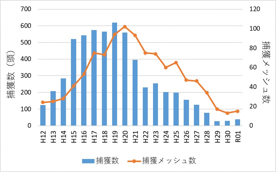 ※メッシュ: 基準地域メッシュ(三次メッシュ)と呼ばれるもので、おおよそ1km四方。捕獲結果の集計に用いている。