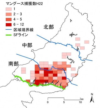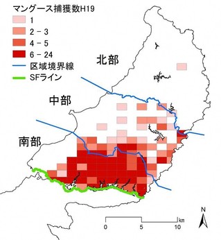 図2.SFライン以北のマングースの捕獲数と捕獲メッシュ数の年度別推移
