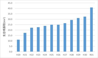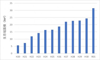 オキナワトゲネズミ、ケナガネズミともにかつては大宜味村塩屋と東村平良以北に分布していたとされていますが、マングースやノネコなどの捕食により、分布が縮小し、ほとんど生息が確認できない状況になっていました。希少種情報であることからこれらの生息域は図示しませんが、平成20年度以降、オキナワトゲネズミ、ケナガネズミともに生息していると推定される範囲の面積が増加傾向にあります(図5、6)。この2種はイタジイの堅果などの環境要因でも生息状況が変動する可能性が考えられますが、今後も同様の調査を継続していくことで、外来種排除との関連性が明らかになっていくと考えられます。