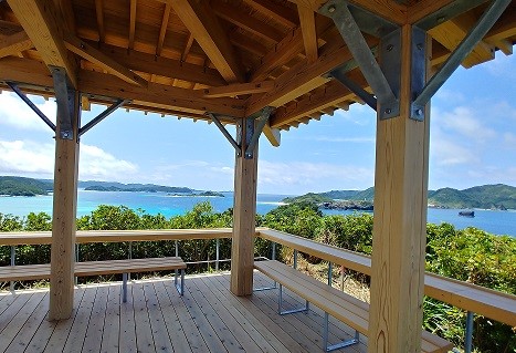 「神の浜テラス」は、座間味島の西側に位置する神の浜園地の既存の展望施設が老朽化したため、新たな展望・休憩施設として再整備したものです。ケラマブルーと称される青い海、白い砂浜、緑豊かな島々がおりなす海と陸が一体となった雄大な景観を味わうことができます。施設内には、日陰を確保したカウンターテーブルやベンチを設置しており、ゆっくりと島の時間を過ごすことができます。
