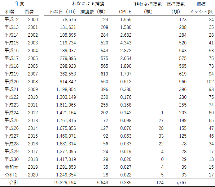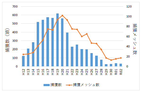 **メッシュ: 基準地域メッシュ(三次メッシュ)と呼ばれるもので、おおよそ1km四方。捕獲結果の集計に使用している。