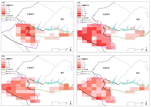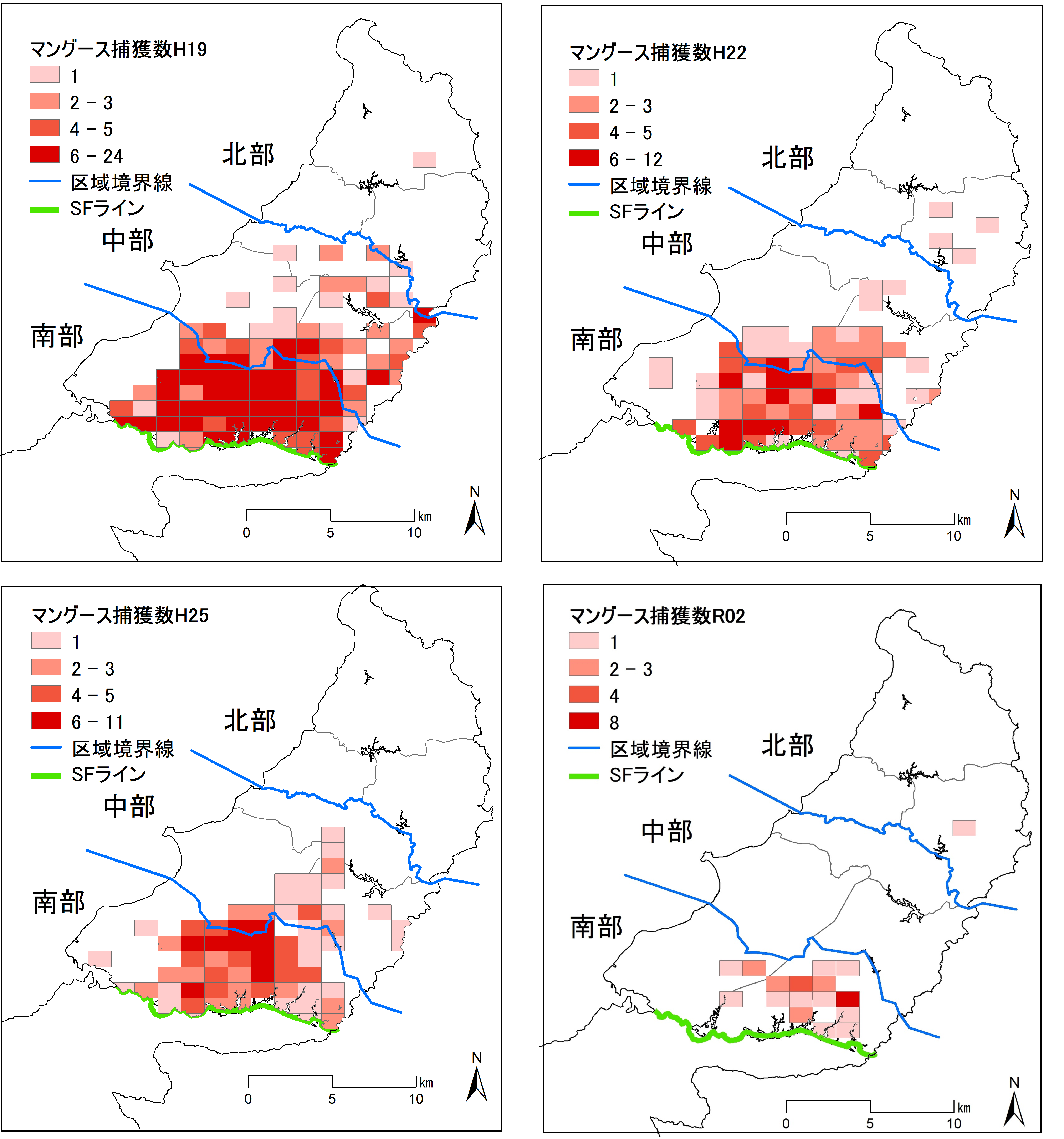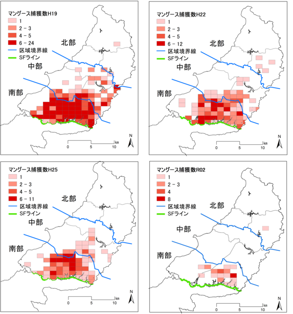 図3.SFライン以北における年度ごとのマングース捕獲メッシュ(左上:H19、右上:H22、左下:H25、右下:R02)