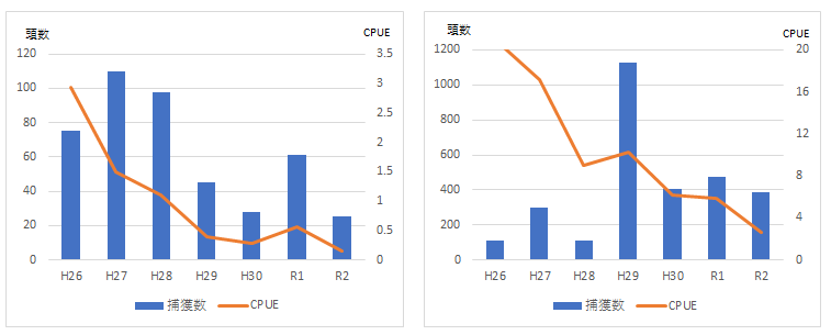 令和2(2020)年度の捕獲数は、前年度よりもやや減少し、最も捕獲数の多かった平成19(2007)年度(619頭)と比べると19分の1程度となりました。CPUE(1,000わな日あたりの捕獲数)は0.022となり、マングースの捕獲数は減少しています。