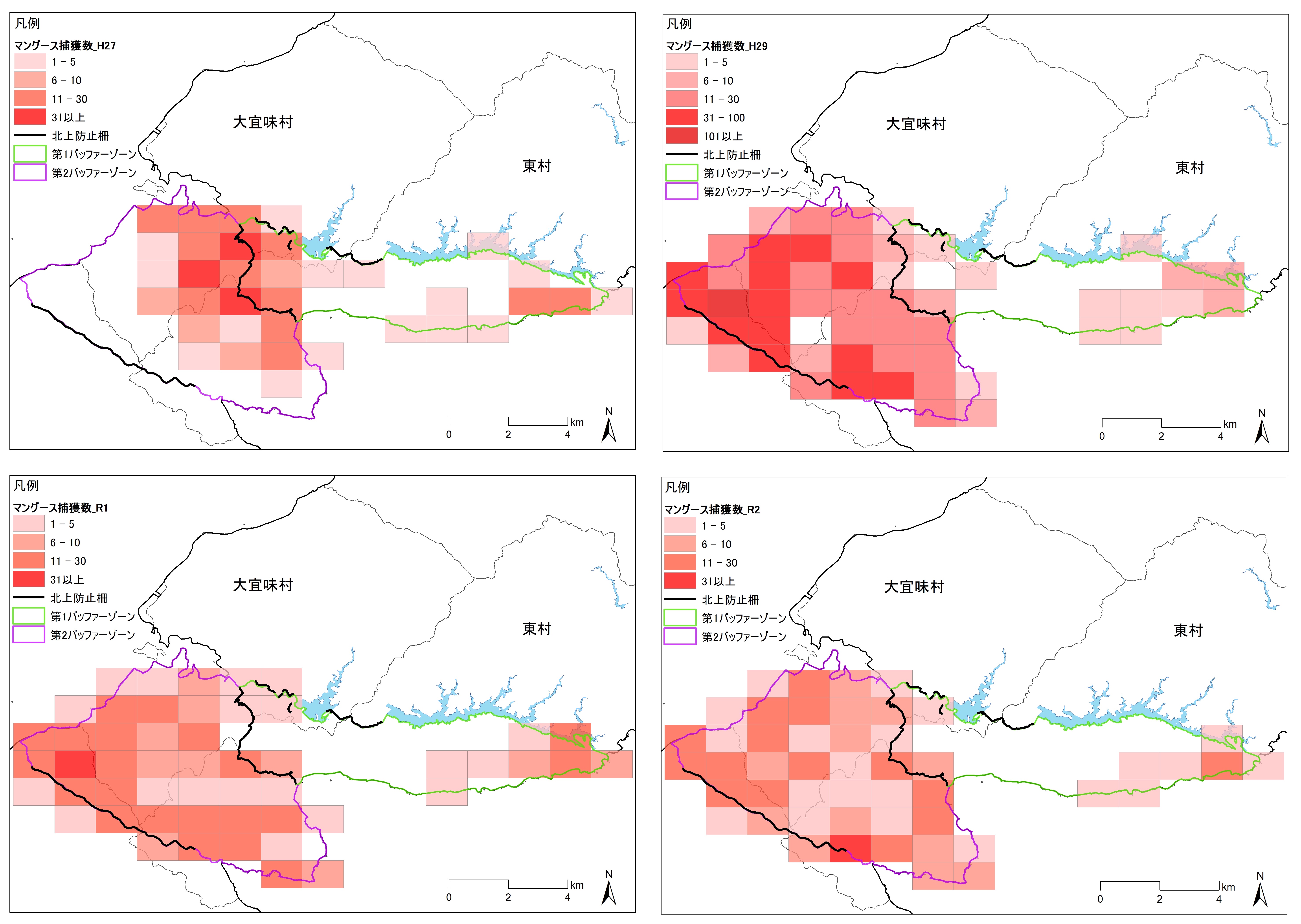 図5.バッファーゾーンにおける年度ごとのマングース捕獲状況(左上:H27、右上:H29、左下:R01、右下:R02)