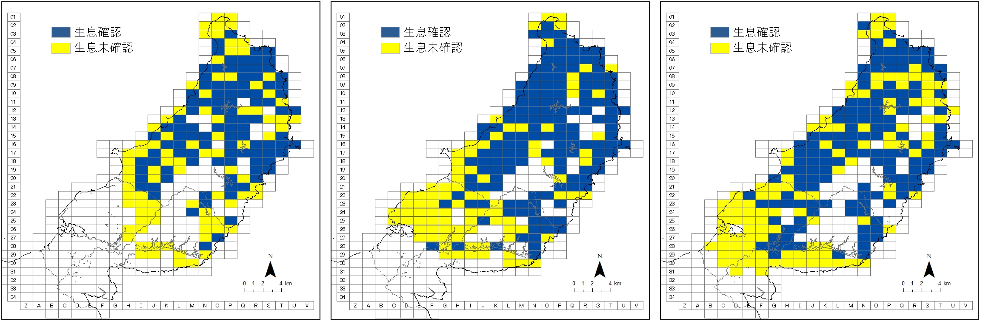 図6.ヤンバルクイナの生息確認メッシュの推移(左:H19、中央:H25、右R02)