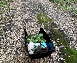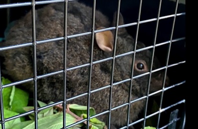 令和3年4月14日、宇検村湯湾と部連の間の県道79号線上で交通事故があり、負傷したアマミノクロウサギ(オス、成獣)が保護されました。保護された個体は大きな外傷や骨折はなく、奄美いんまや動物病院で伊藤圭子獣医師により治療と経過を観察しました。頭部打撲によると思われる神経症状が見られましたが、投薬などにより一過性で改善されました。4月19日に奄美野生生物保護センターに移送して二晩、少し広い屋外ケージで自動撮影カメラを利用して行動を観察しました。運動能力についても問題ないと判断し、4月21日夕方に保護場所近くの山中に放獣しました。放獣場所は再度道路に出現することがないよう、県道からやや離れた森林内を選定しました。