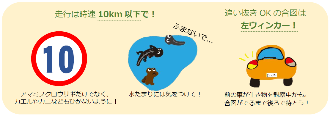 ・カエルやイモリ、オタマジャクシ等の生活の場である水たまりはなるべく車で踏まない。
