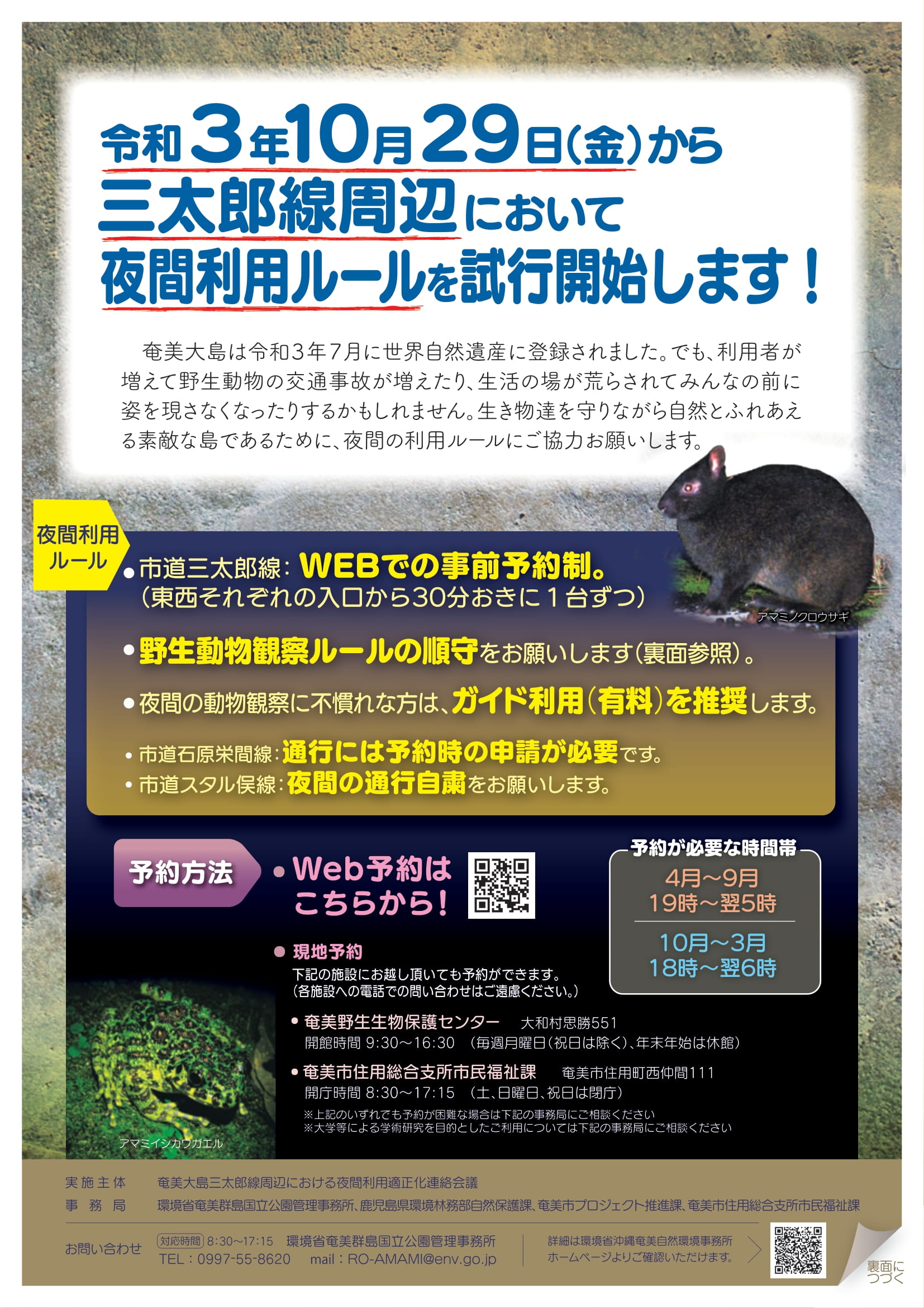 令和3年10月29日(金)から、奄美大島の市道三太郎線、市道スタルマタ線及び市道石原栄間線周辺において、夜間利用ルールの試行を開始します。ご利用に当たっての事前予約の受付は、令和3年9月1日(水)午前10時より開始します。野生動物の保護と質の高い利用の両立に向けて、ご理解とご協力をよろしくお願いいたします。